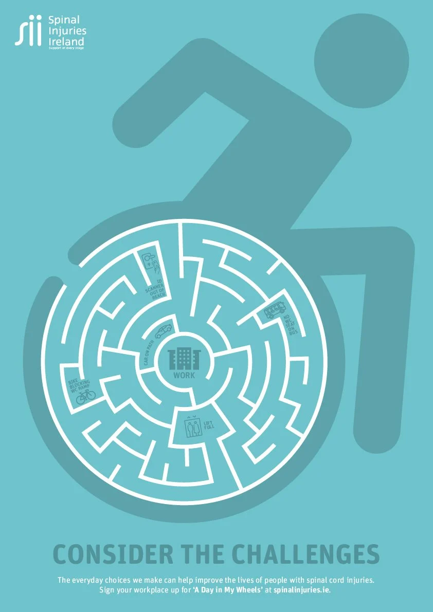 Puzzles, challenges and games often grab the attention of readers mindlessly flicking through the newspaper. By adapting the chair wheel into a maze, we can encourage the reader to question their mindless actions and consider the many overlooked factors of able-bodied people’s lives. Our execution encourages the reader to physically pick up their pen and place themselves in the world of the wheelchair user on their commute to work, prompting them to get around some of the challenges society unintentionally places before them. In turn, we aim to convert the readers into allies that advocate for accessibility.